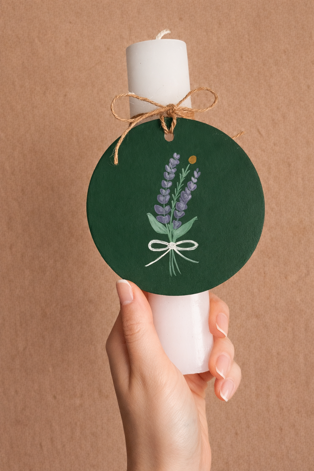 Λαμπάδα με καρτελάκι λεβάντα ζωγραφισμένο στο χέρι και στιχάκι
