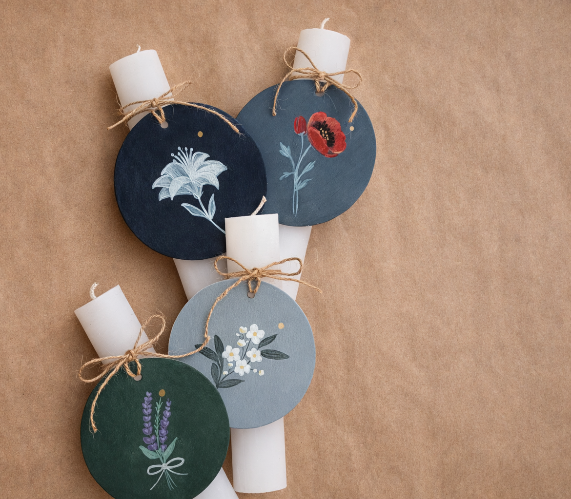 Λαμπάδες με καρτελάκι λουλούδια ζωγραφισμένο στο χέρι και στιχάκι