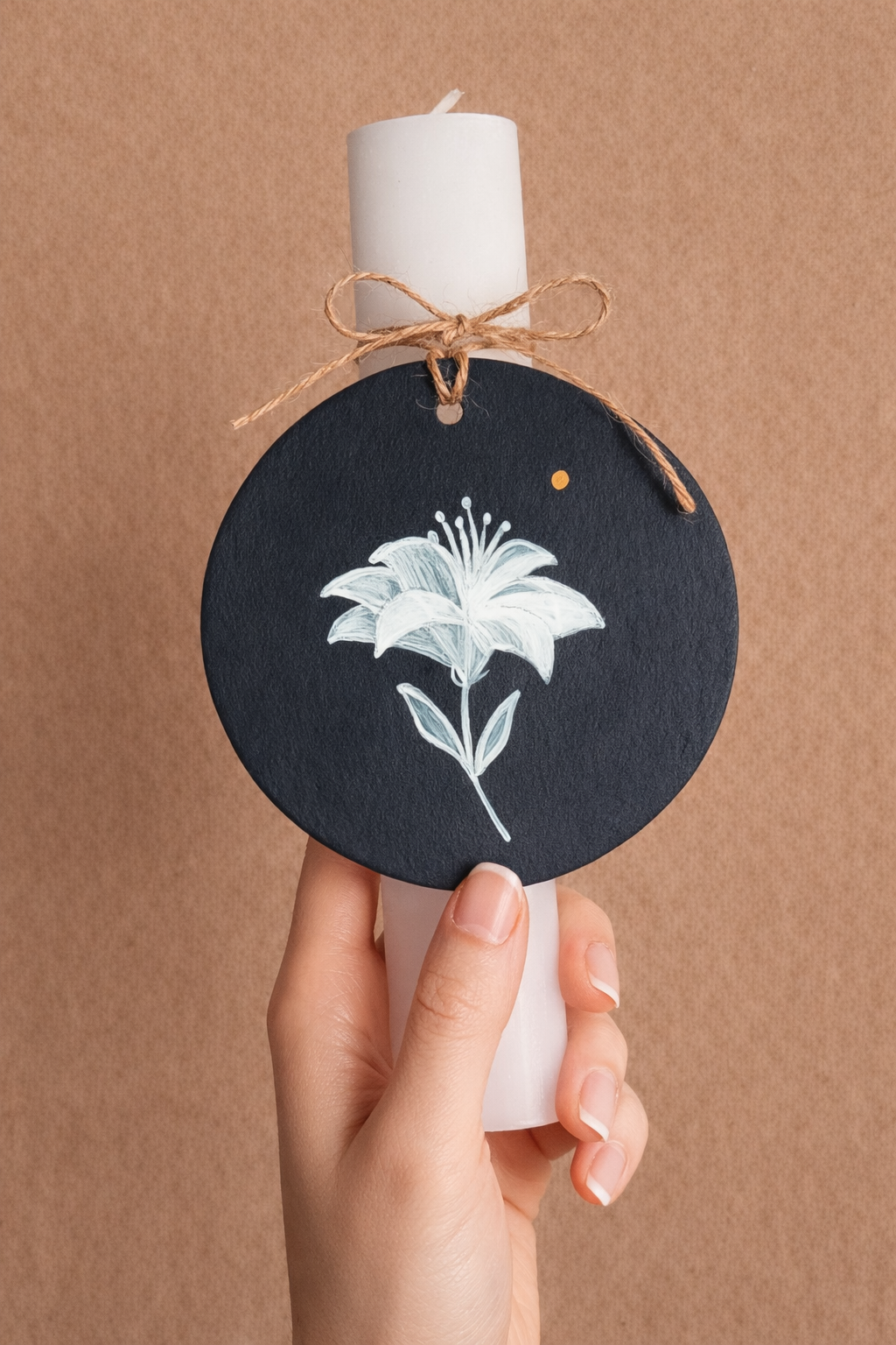 • Λαμπάδα με καρτελάκι ανθό ελιάς ζωγραφισμένο στο χέρι και στιχάκιSold